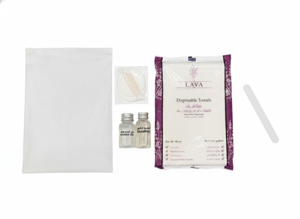 - يحتوي على جميع أساسيات الاستحمام: شامبو، جل استحمام، منشفة استخدام مرة واحدة، مسحة قطن، أعواد تنظيف الاذان، ومبرد الاظافر.